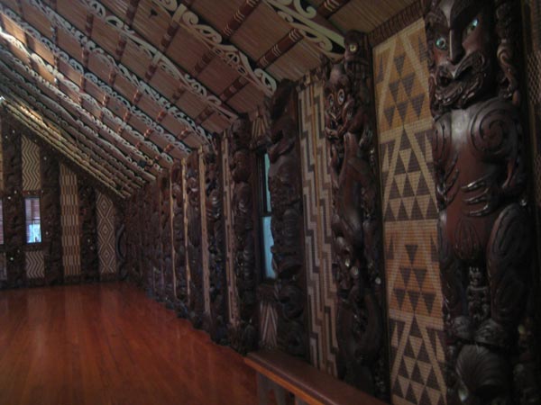hier die große halle, in der die holzpanele aller maori stämme versammelt sind, sogar die muster und die deckenbemalung haben eine bedeutung