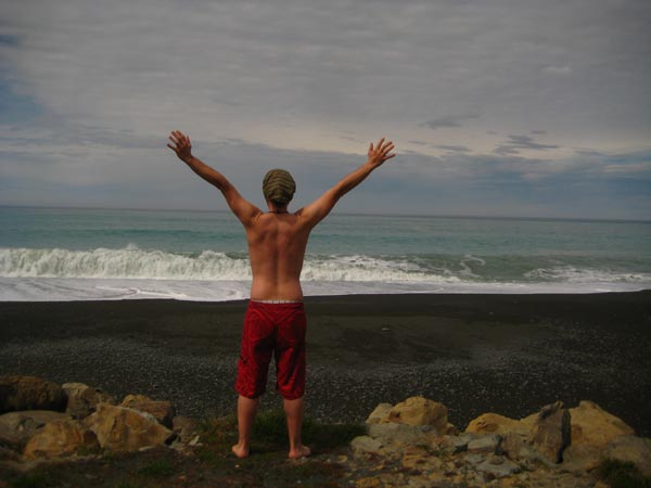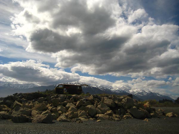 dann n weiterer tagestrip von chch nach norden richtung kaikoura, sammle noch nen deutschen backpacker von unterwegs ein, er will nach kaikoura, ok fahren wir dahin, als ich ihn in der stadt abgesetzt hab fahr ich n stück zurück, hab da nen sweet spot entdeckt, in der tat, eine fiese dirtroad führt direkt an den strand, im hintergrund die schneebedeckten berge, hammer! das ist einfach nu schön, aber es sollte noch besser kommen